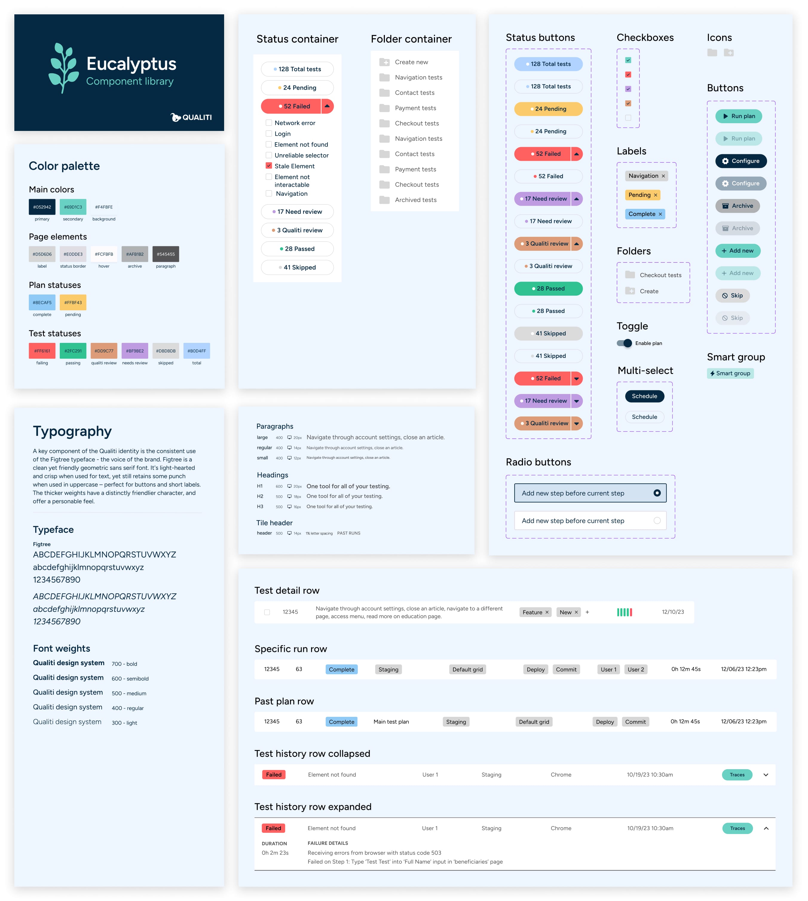 The Eucalyptus Design Library was created for the Qualiti product and engineering team. Through the use of reusable components established in Eucalyptus, products and front-end code will follow a consistent design. It will also allow the team at Qualiti to deliver prototypes and products quickly.